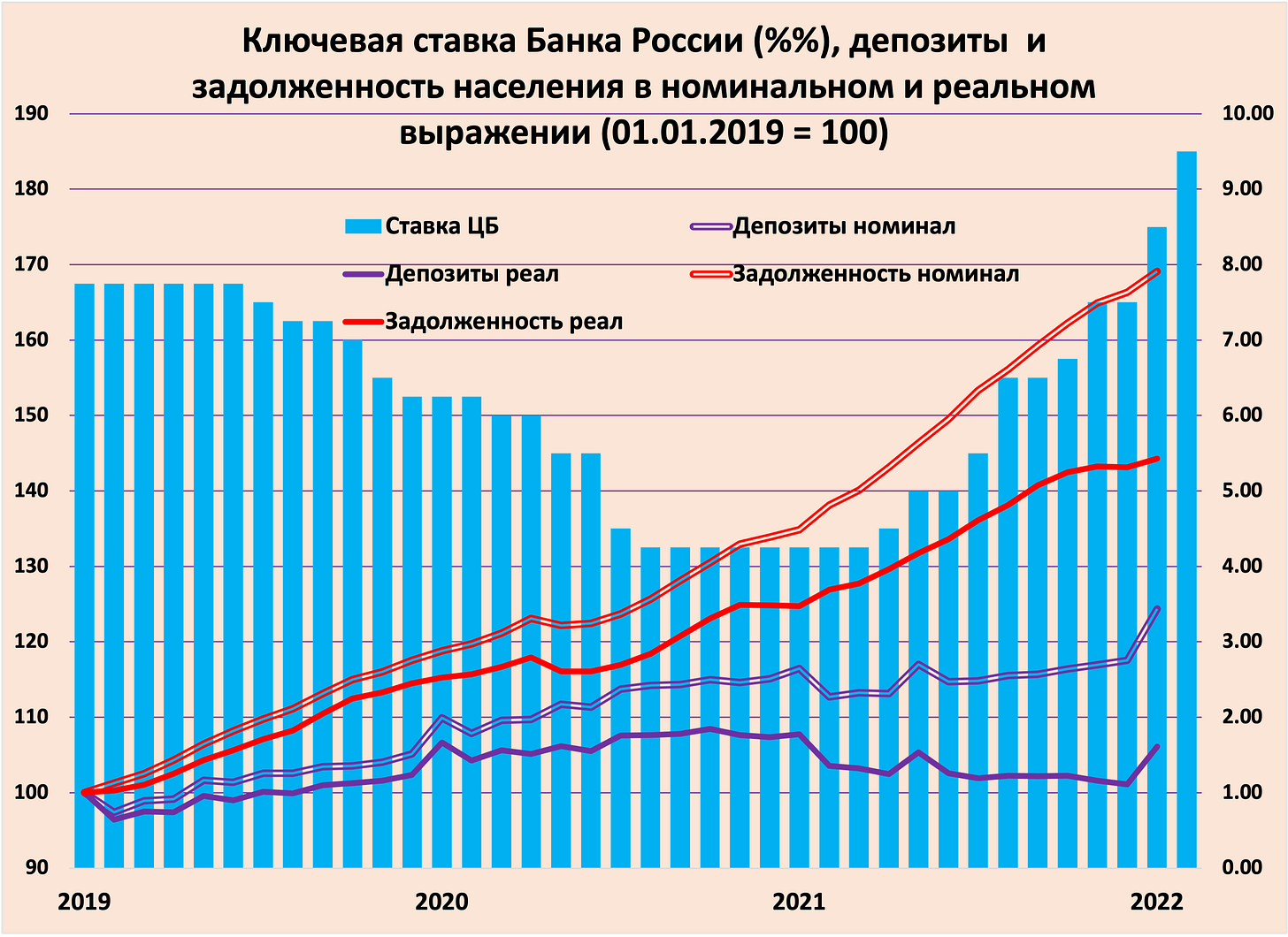 Во время острой фазы кризиса, вызванной пандемией, в России правительство поддерживало экономику не со стороны спроса, а со стороны предложения: выплаты населению были существенно меньше, чем финансовая помощь предприятиям. В результате, в отличие от развитых стран, реальные доходы российского населения сократились, а рост сбережений в реальном выражении был крайне незначительным (менее 1% в 2020 г. против 6,7% в 2019 г.). Хотя ускорение инфляции в 2021 г. сопровождалось повышением ключевой ставки Банка России, это не привело к росту сбережений населения – они выросли всего на 6,8% в номинальном выражении при росте инфляции на 8,4%.