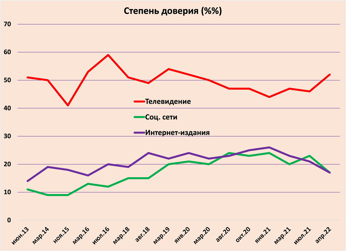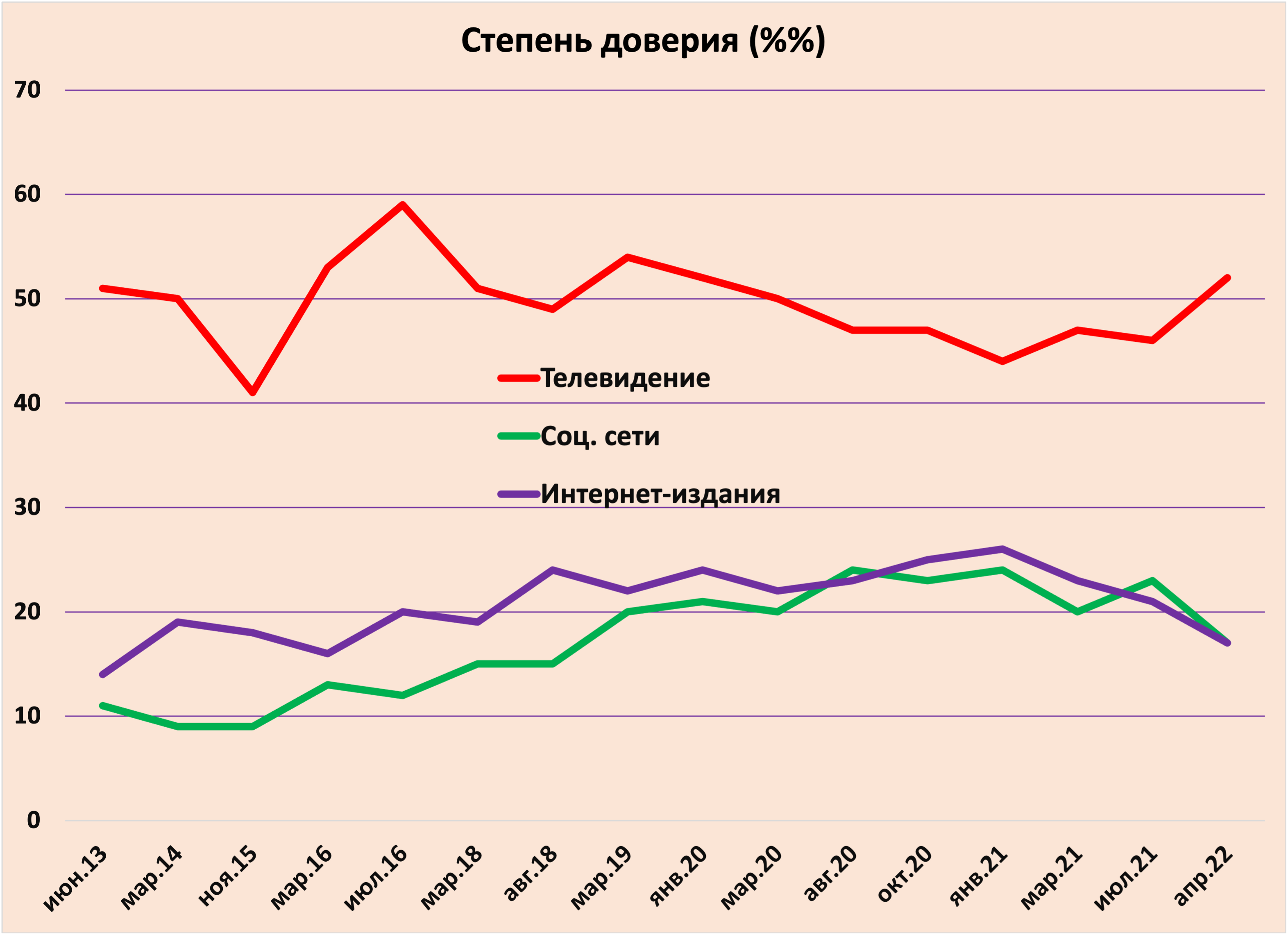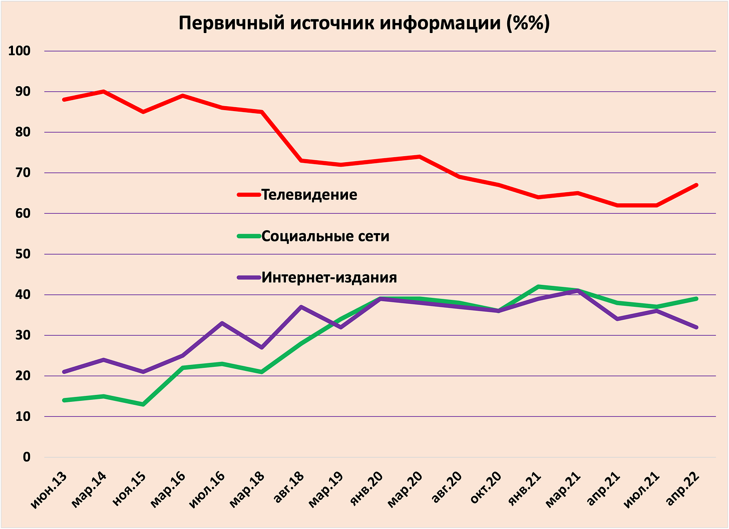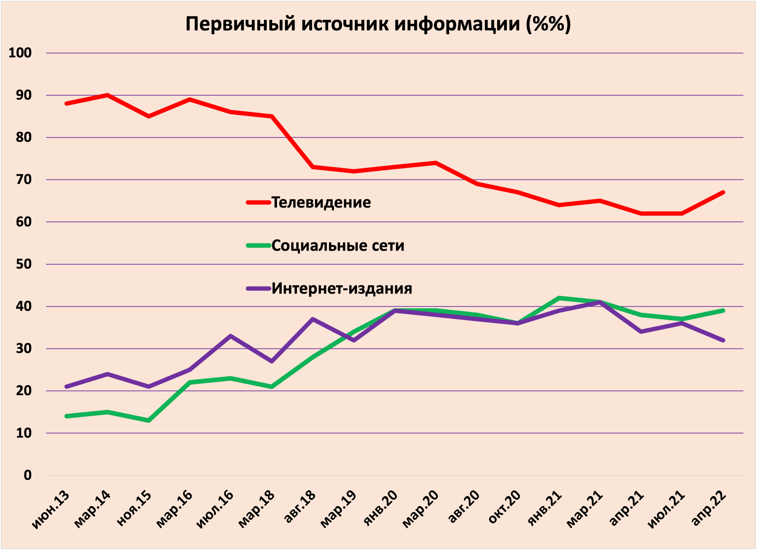 Опрос Левада-центра говорит о том, что телевидение остается основным источником информации у россиян. Хотя его популярность как основного способа получения новостей постепенно снижается, с начала 2021 г. этот процесс сильно замедлился. Несколько раньше, в начале 2020 г. прекратился рост внимания россиян к социальным сетям и интернет-изданиям, что связано с агрессивной цензурой и прекращением работы многих медиа по решению Кремля.