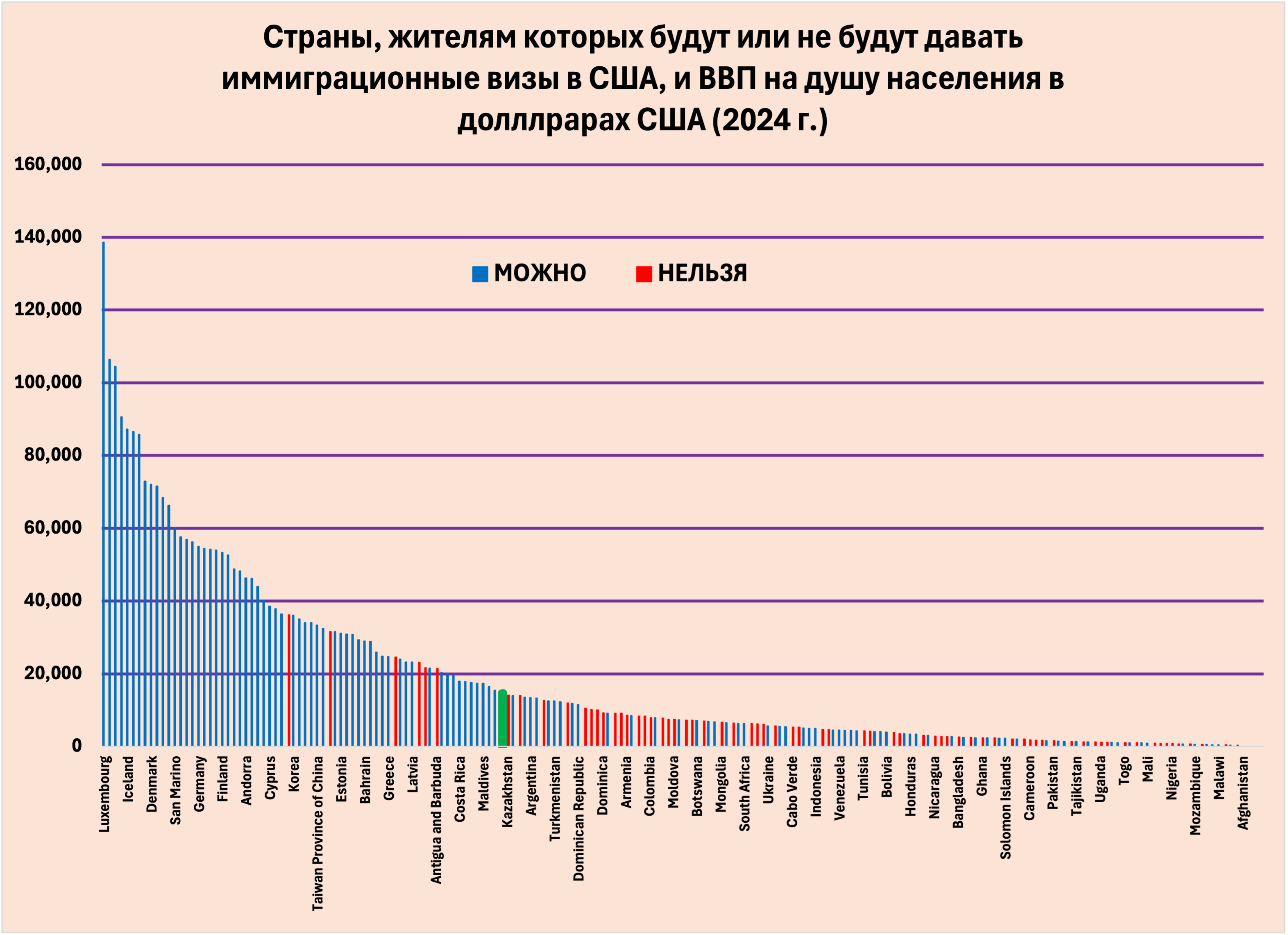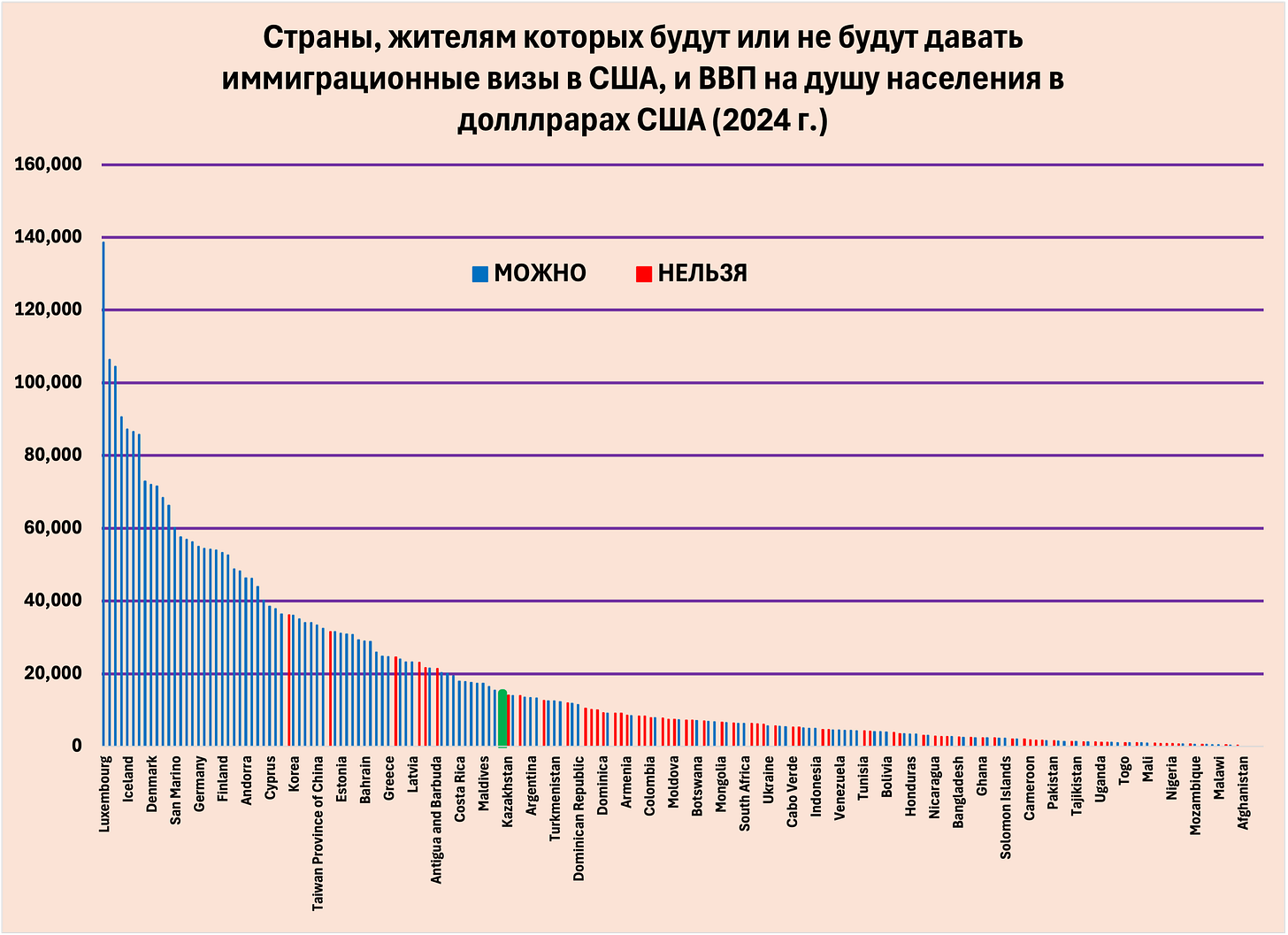 Из хороших новостей, Россия стала седьмой по уровню достатка (ВВП/человека) в списке тех, кому визы давать не будут. Из плохих новостей, в челом, Россия занимает 68-е место по этому показателю. (На графике Россия показана зелёным цветом).