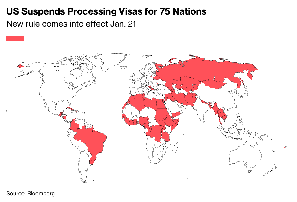 Госдеп опубликовал список 75 стран, жителям которых, начиная с 21 января, не будут давать иммиграционные визы в США. Сразу нужно уточнить: речь идёт о тех, кто претендует на право на жительство в США по причине наличия там родственников (дети, родители и прочие родственники). Администрация Белого дома считает, что мигранты такого рода создают слишком большую нагрузку на систему социального и медицинского обеспечения.