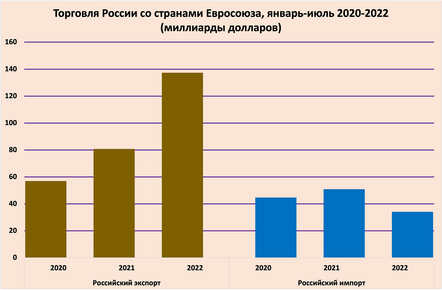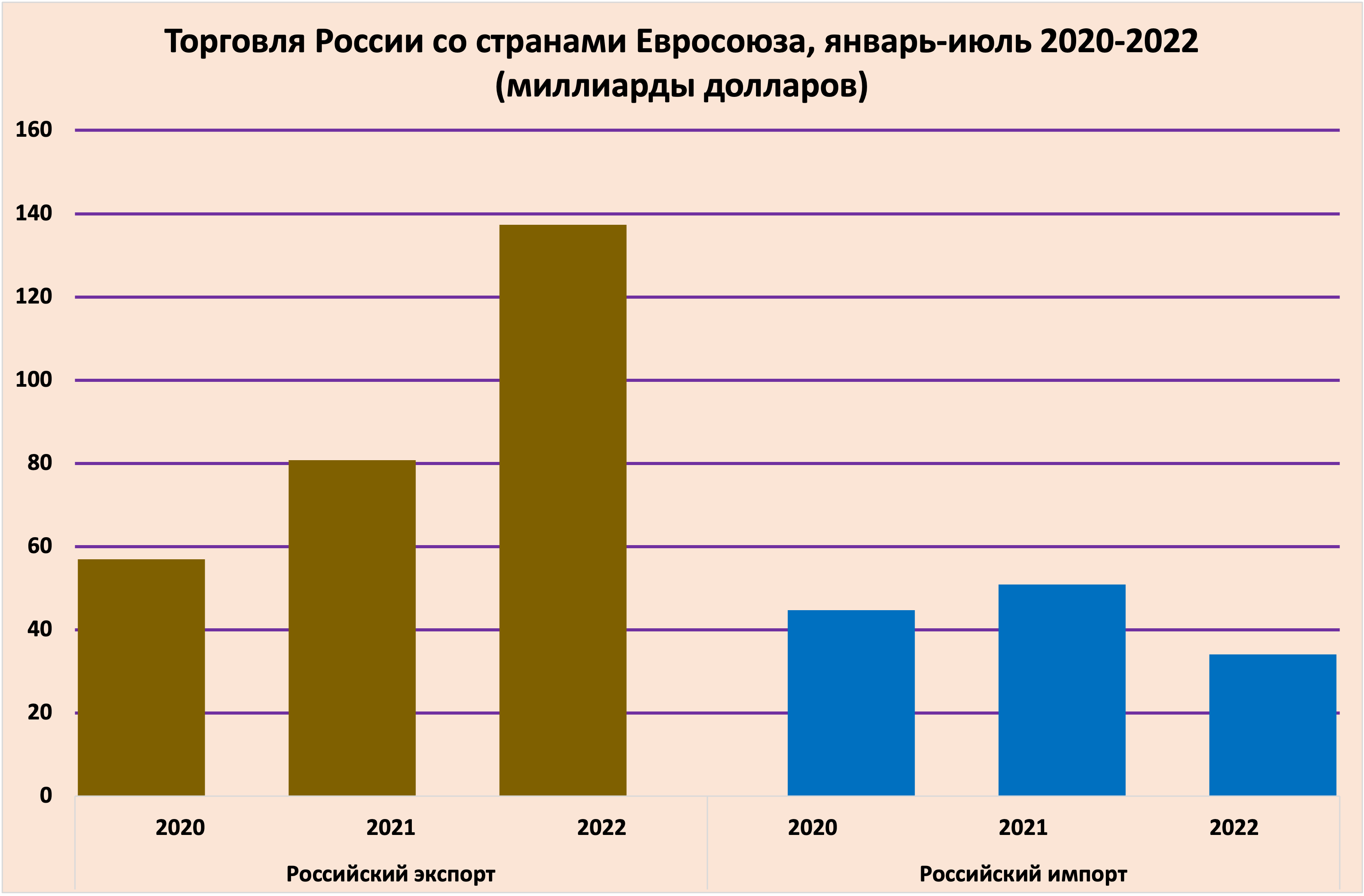 За семь месяцев (январь-июль) импорт товаров из стран Евросоюза в Россию сократился на 33%, в том числе в июле – на 46.9% по сравнению с прошлым годом. За это время стоимость российского экспорта в страны Евросоюза выросла на 69.9% (в июле – на 25.2%).