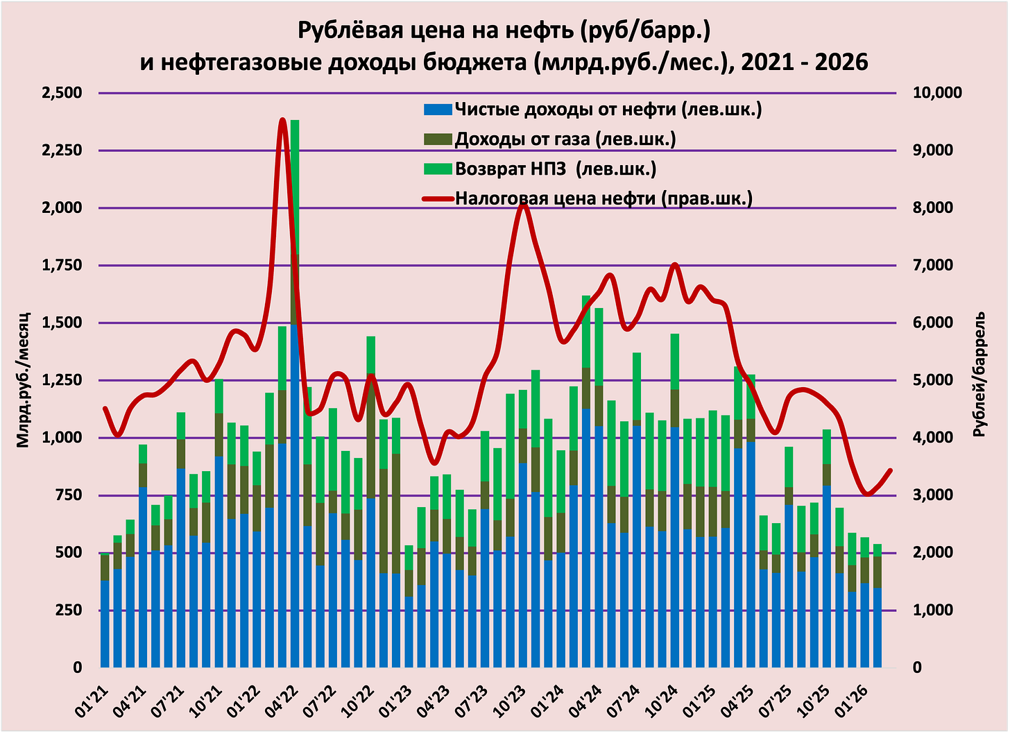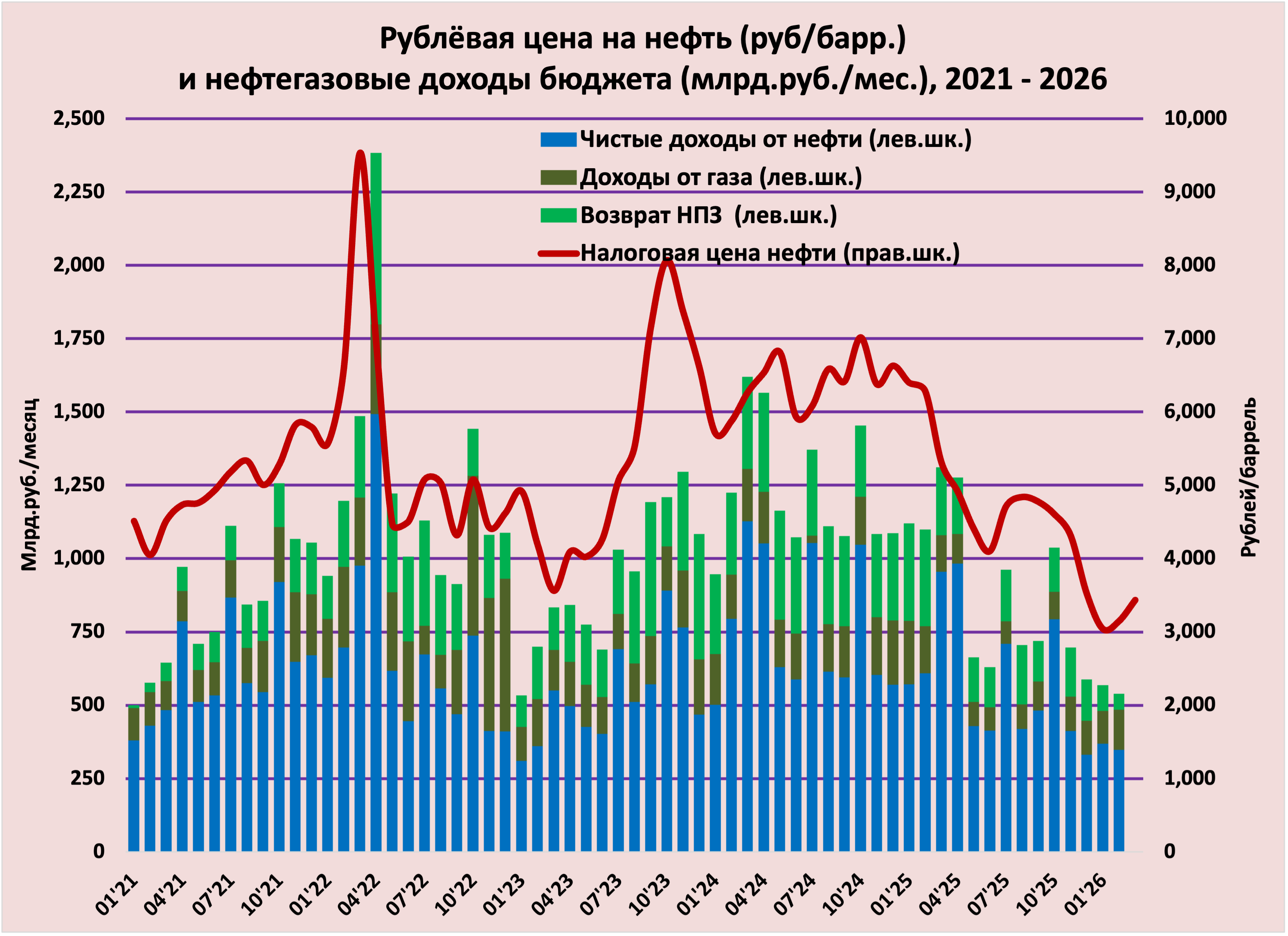 Прогноз на март. То, что цены на российскую нефть сильно подросли в результате ударов по Ирану и перекрытия Ормузского пролива, никак не повлияет на доходы марта – это найдёт своё отражение в доходах апреля. Средняя цена экспортной нефти за февраль составила $44.59 (плюс 9%) к январю, количество календарных дней в марте 31 против 28 в феврале; таким образом, если курс рубля не сильно поменяется, то можно ожидать, что доходы подрастут на 45-55 млрд.рублей. ПЛЮС – в марте нефтяникам предстоит уплата налога на добавленный доход, который может составить 180-200 миллиардов (это моя интуитивная оценка, т.к. для расчёта этого налога нужно иметь очень подробные данные, порой по отдельным месторождениям).