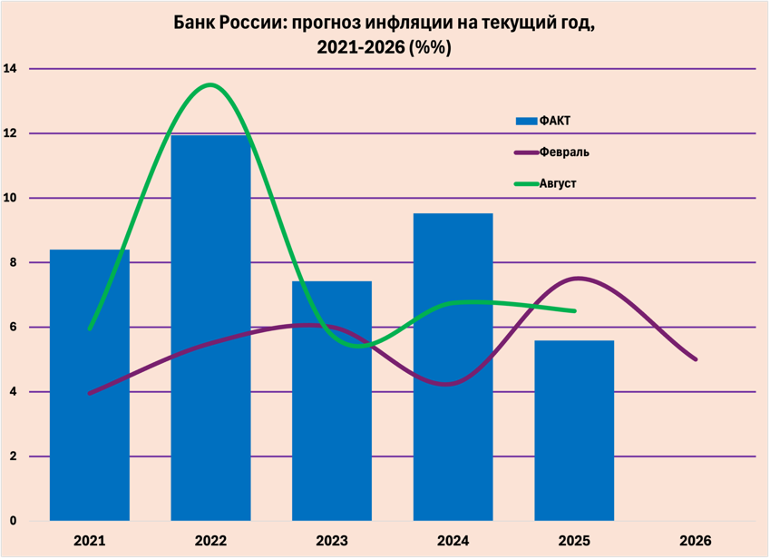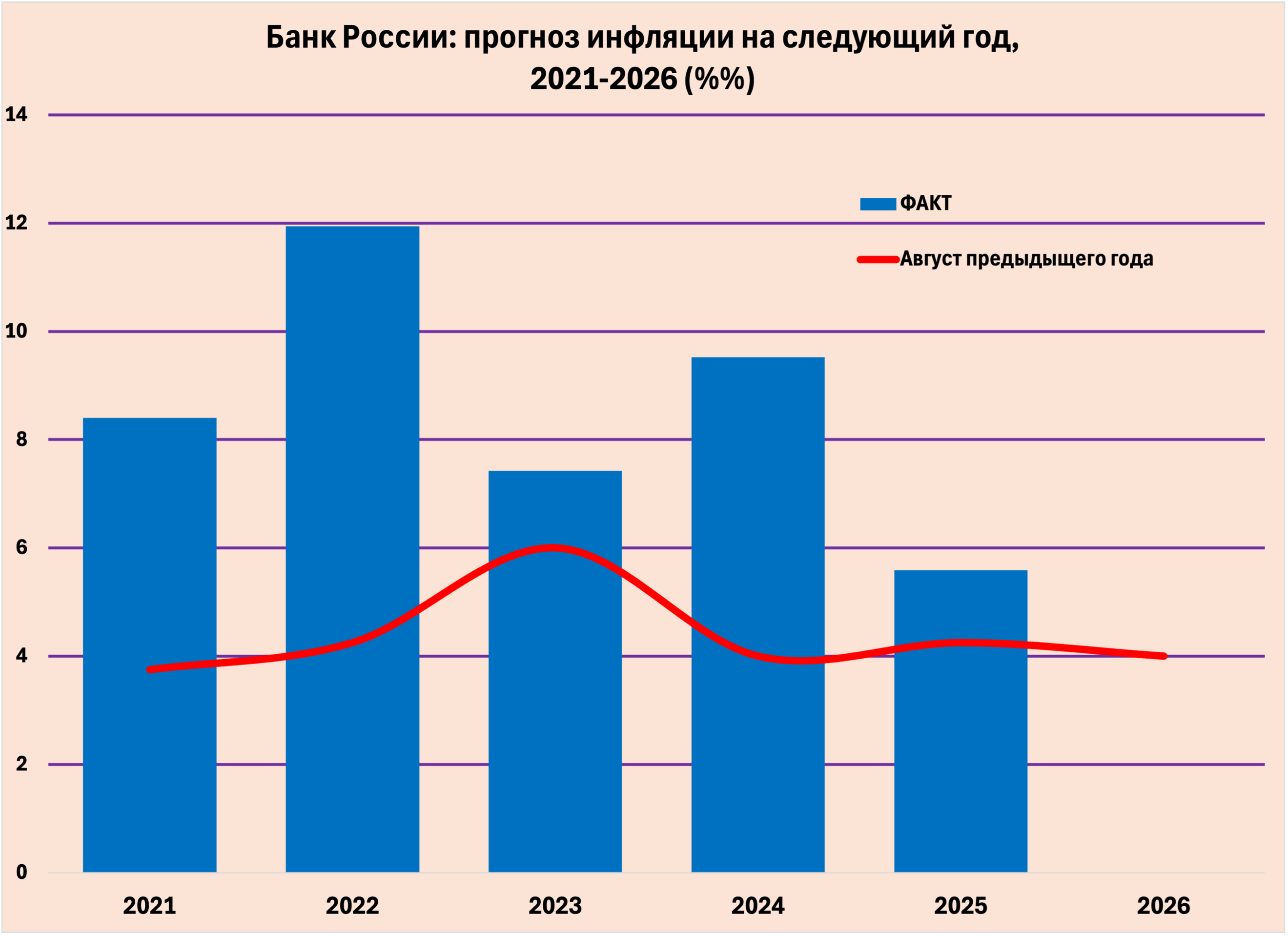 Получается, что даже в августе, т.е. за пять месяцев до конца года, Банк России не видит куда движется инфляция, независимо от того находится она на подъёме (2021, 2023, 2024) или на спаде (2022, 2025).