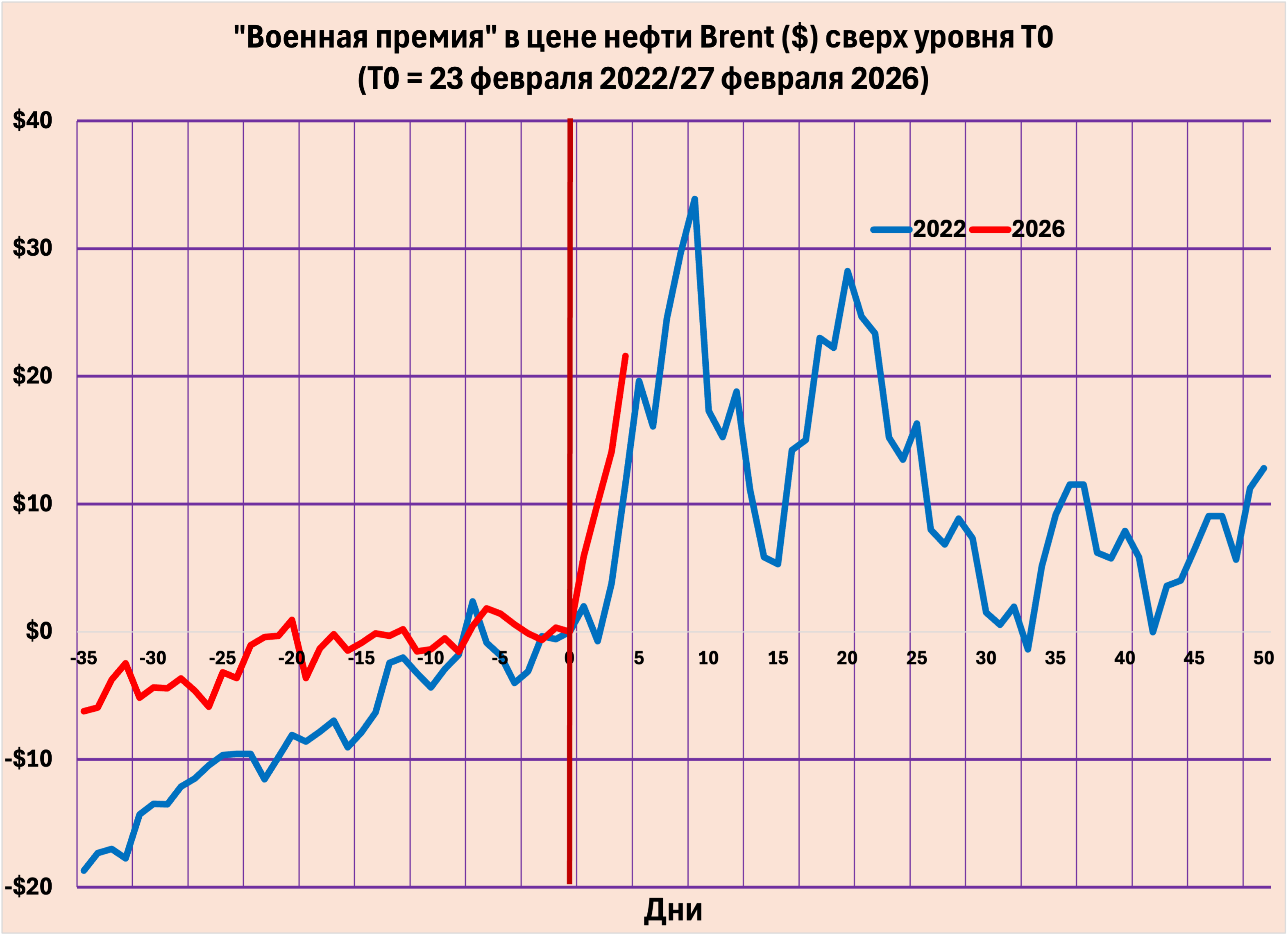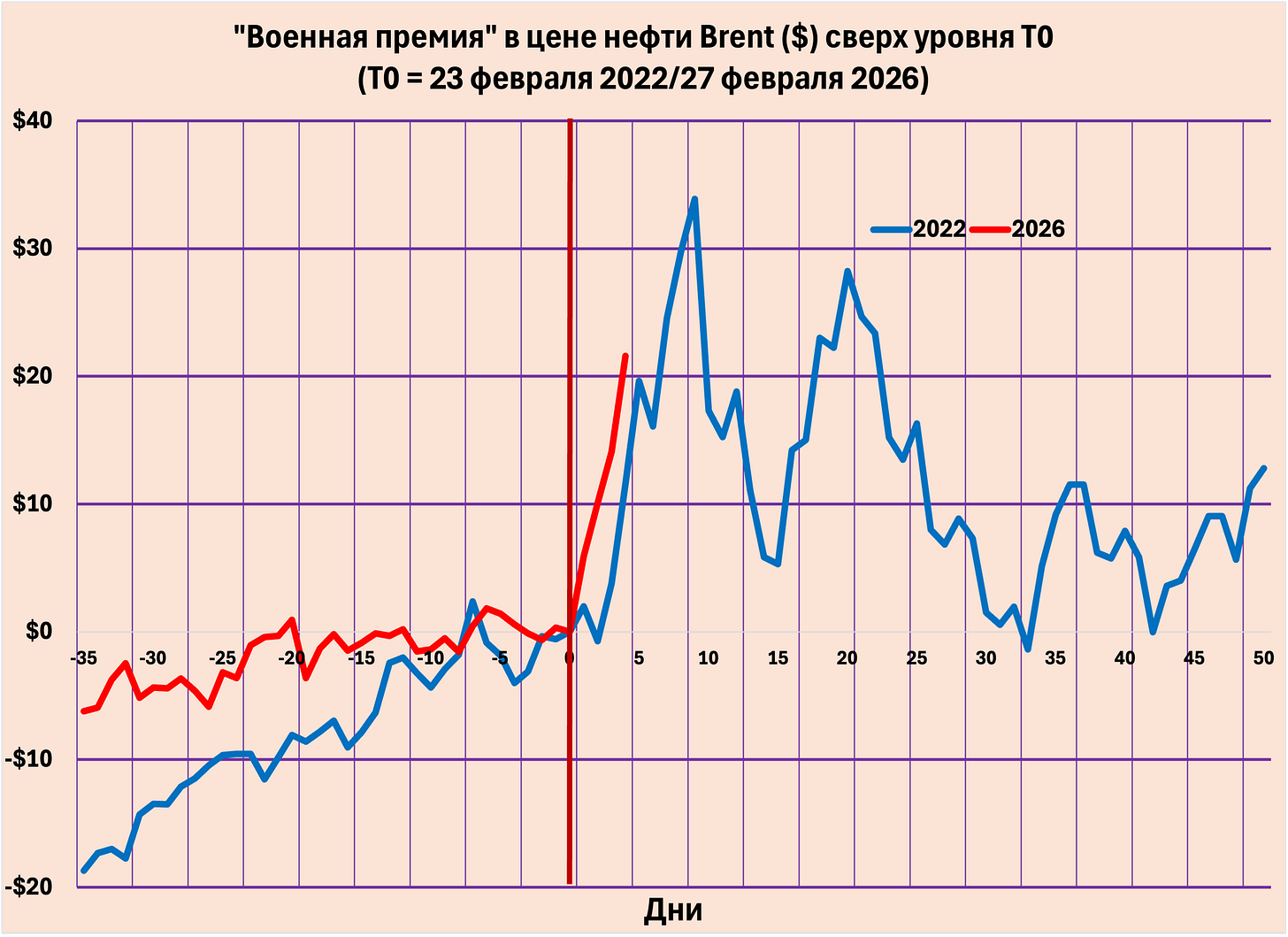 В 2022-м рынки, судя по всему, ожидали войну. Об этом может говорить то, что с двадцатых чисел декабря, когда цена Brent, слегка превышавшая $70/баррель, начала устойчиво расти, и накануне российского вторжения упёрлась в отметку $100. В 2026-м рынки не ожидали военной операции США/Израиля, и с конца января вплоть до последнего дня цены на Brent держались в очень узком диапазоне, $70-72/барр.