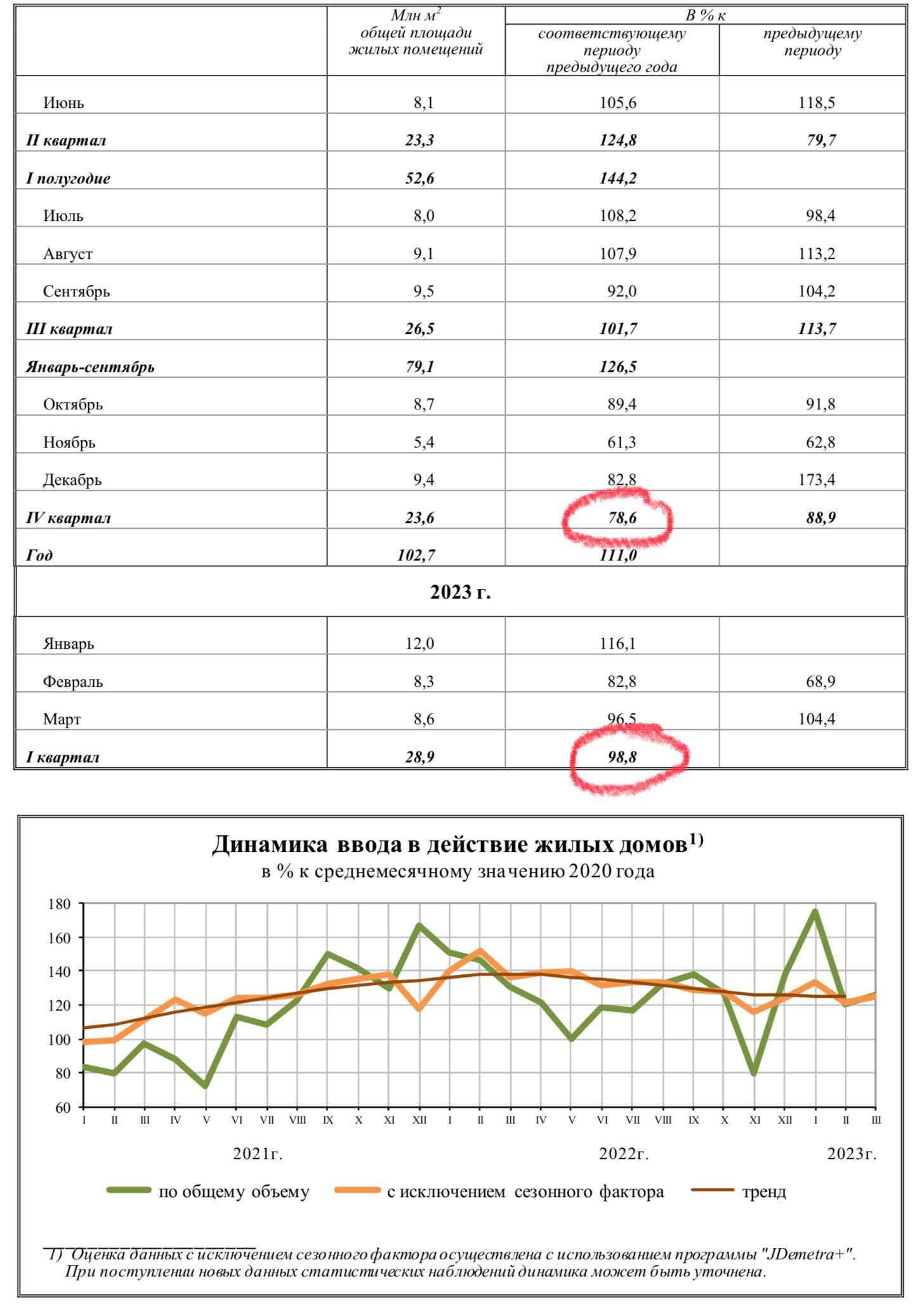 Уходя немного в сторону от “военной” тематики, нужно сказать, что падение производства строительных материалов является очевидным предвестником неизбежного спада в жилищном и инвестиционном строительстве. Хотя вице-премьер Хуснуллин, отвечающий за строительство, продолжает “вешать лапшу на уши” Путину о продолжающемся росте строительной отрасли, статистика по итогам первого квартала говорит о том, что спад уже начался.