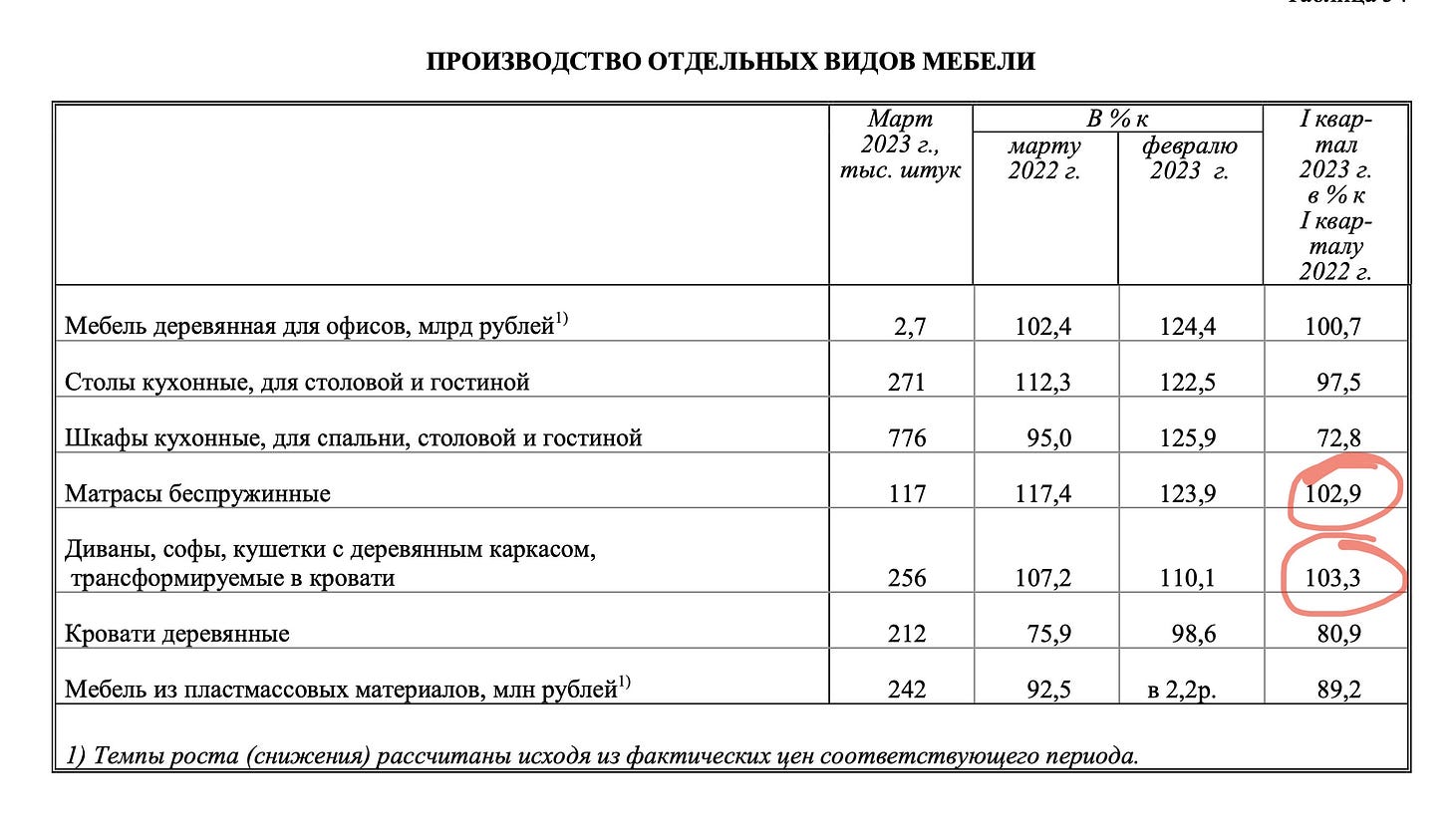 …глядя на расшифровку этой отрасли, можно быстро понять, что опять-таки речь идёт о военных нуждах - выросло исключительно производство беспружинных матрасов (а Вы, что, хотите, чтобы в блиндажи укладывали пружинные?) и того, что можно назвать подобием кроватей. Кроме того, если присмотреться, то можно понять, что из последней таблицы получить рост отрасли в целом (о чём говорится в предыдущей таблице) никак не получится - самые крупные и дорогие позиции (производство кухонные и спальные гарнитуры) показывают падение, а не рост. Если поверить, что производство мебели, действительно, в первом квартале выросло, то только за счёт тех позиций, которые в последней таблице не показаны. А, раз, не показаны, значит, засекречены. А, раз, засекречены, значит, - всё для фронта, всё для победы.